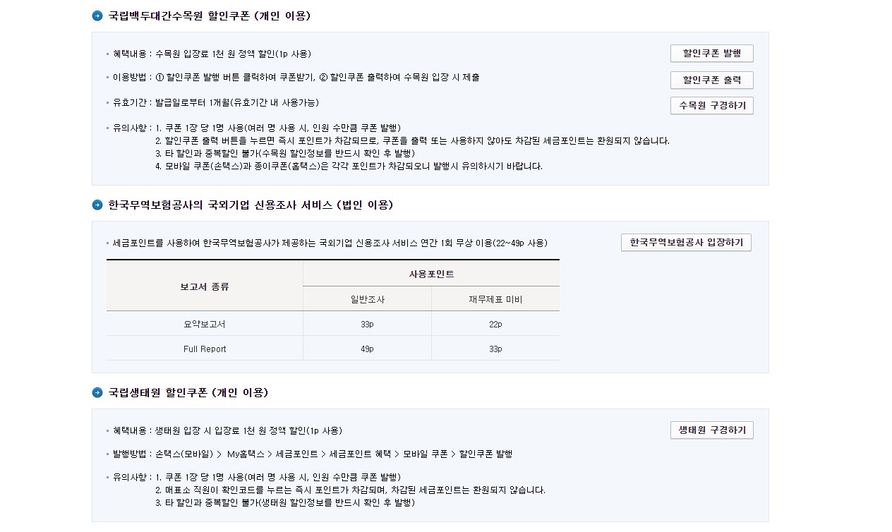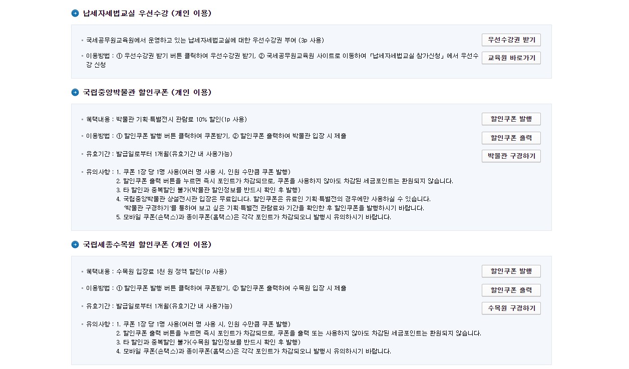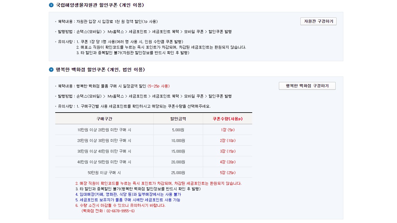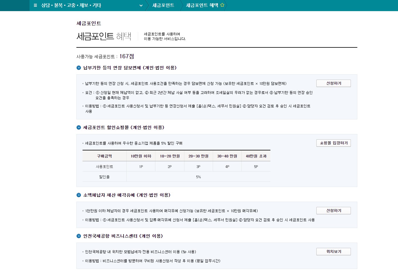 세금포인트를 누르면 쌓인 포인트와 포인트를 사용할수 있는곳이 나옵니다