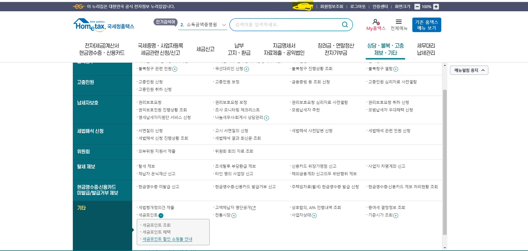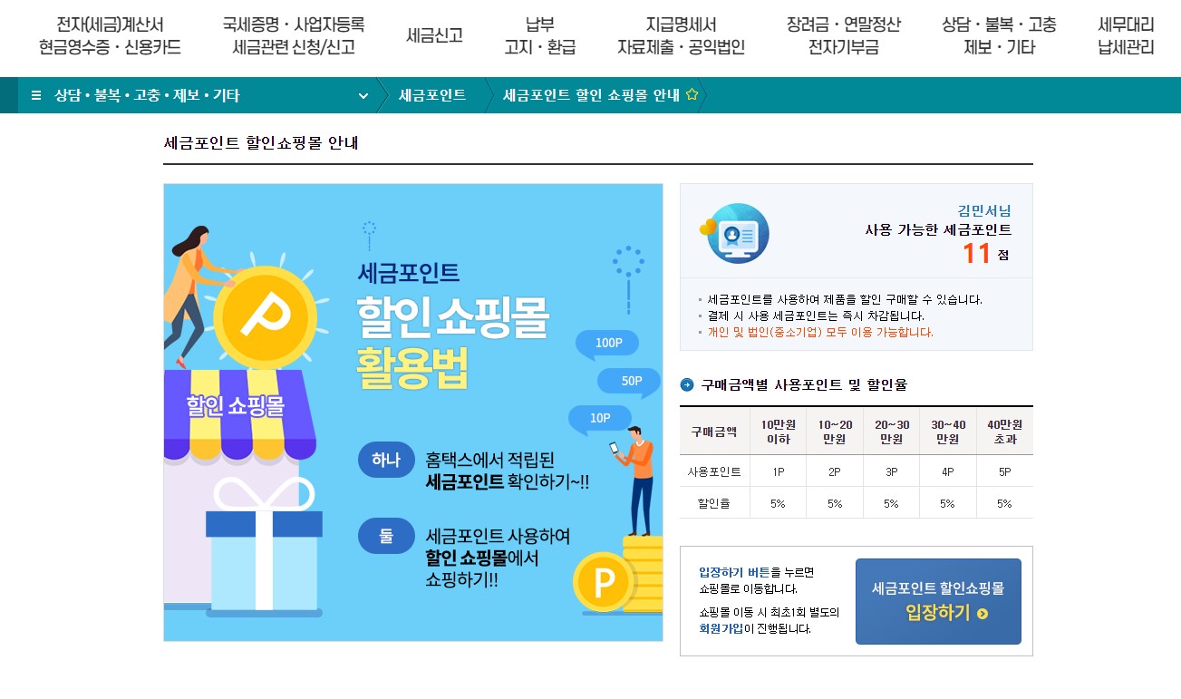 홈텍스에 로그인후 상담,불복,고충 제보 기타를 클릭하면 기타탭에 세금포인트 메뉴가 있습니다